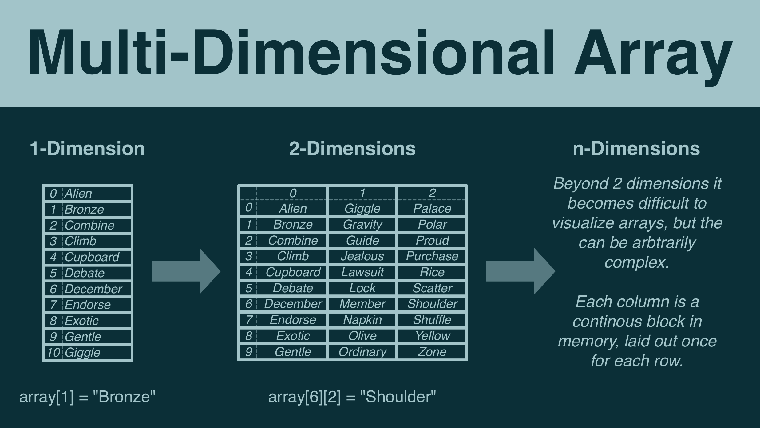 The most important thing to understand is that an array in always set up so that each element is adjacent to each other in memory.