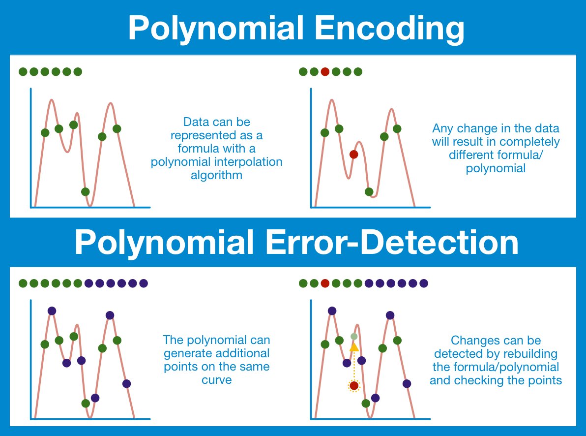 Remember, this all falls back on the principle we discussed earlier: to recreate a polynomial of degree n-1, we need (at least) n points that fall on that line. The extra points provided by the Reed-Solomon code make sure there are always more than n available points.