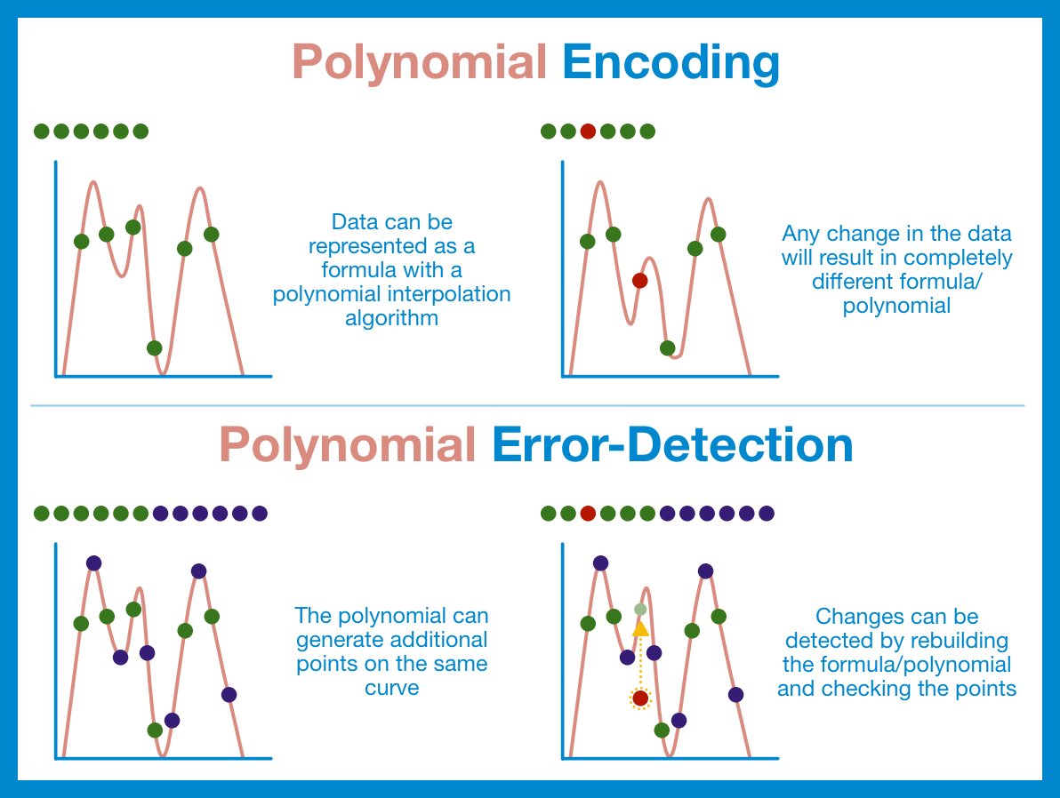 Alright anon, you've got it: polynomial erasure coding transforms data into a polynomial and adds more data to ensure the data is recoverable from just a subset!