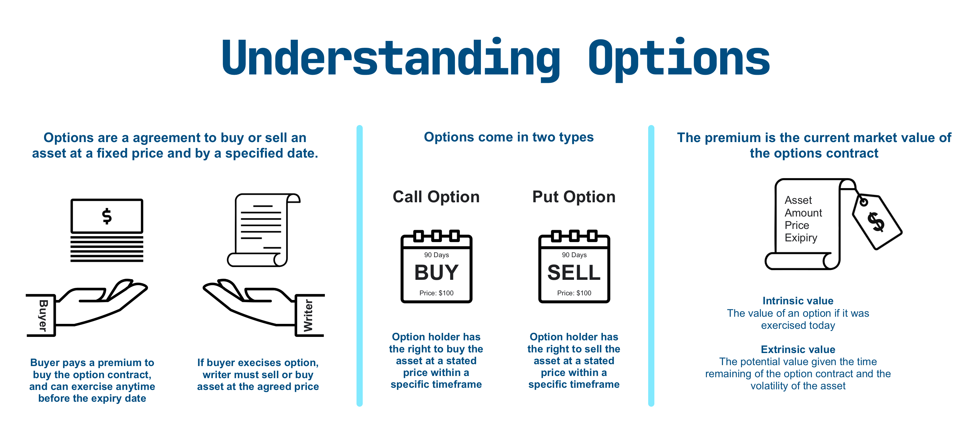 Options are a contract between two parties to buy/sell an asset (in the future) using a fixed price and date. At that future date, the option buyer has the choice whether to continue with the buy/sale; the seller does not.