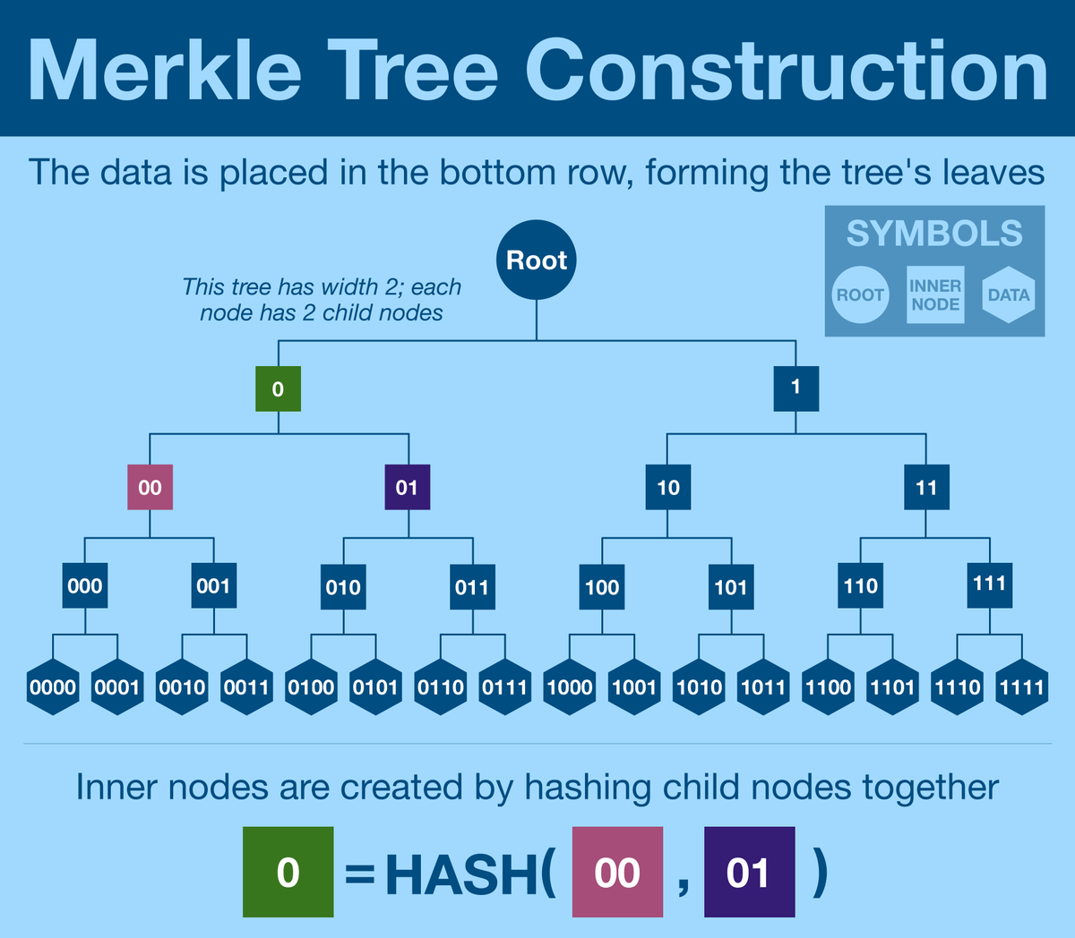 We begin by placing our data into the bottom row and picking a tree width (number of children per node). To move up a level, we simply select [width] number of nodes and hash them together. This continues until a single hash is reached.