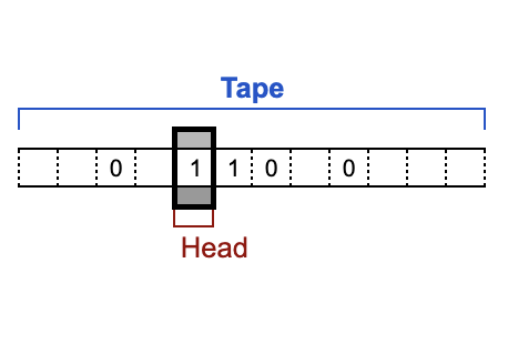 A Turing machine might look like this. While we are going to stick to 0s and 1s, a Turing machine can process any letters, numbers or symbols.