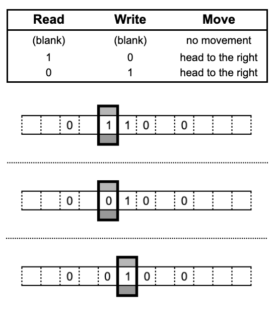 If we run our instruction two more times, we'll find ourselves at a blank space. Our Turing machine will follow our instruction and wait endlessly.