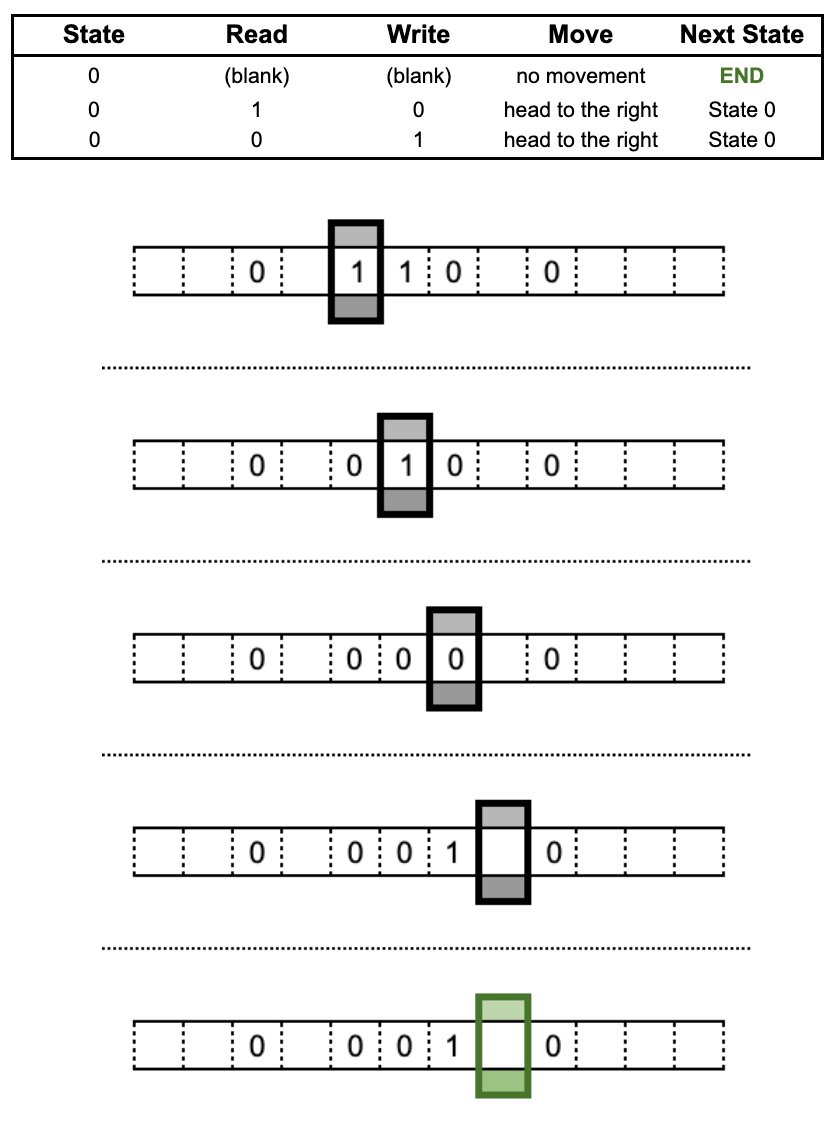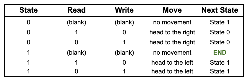 This the end of our example, which is a little silly. All it does it invert the number back and forth, ending in the original state. But with the introduction of more states to our program, we can instruct the Turing machine to perform more complex functions.