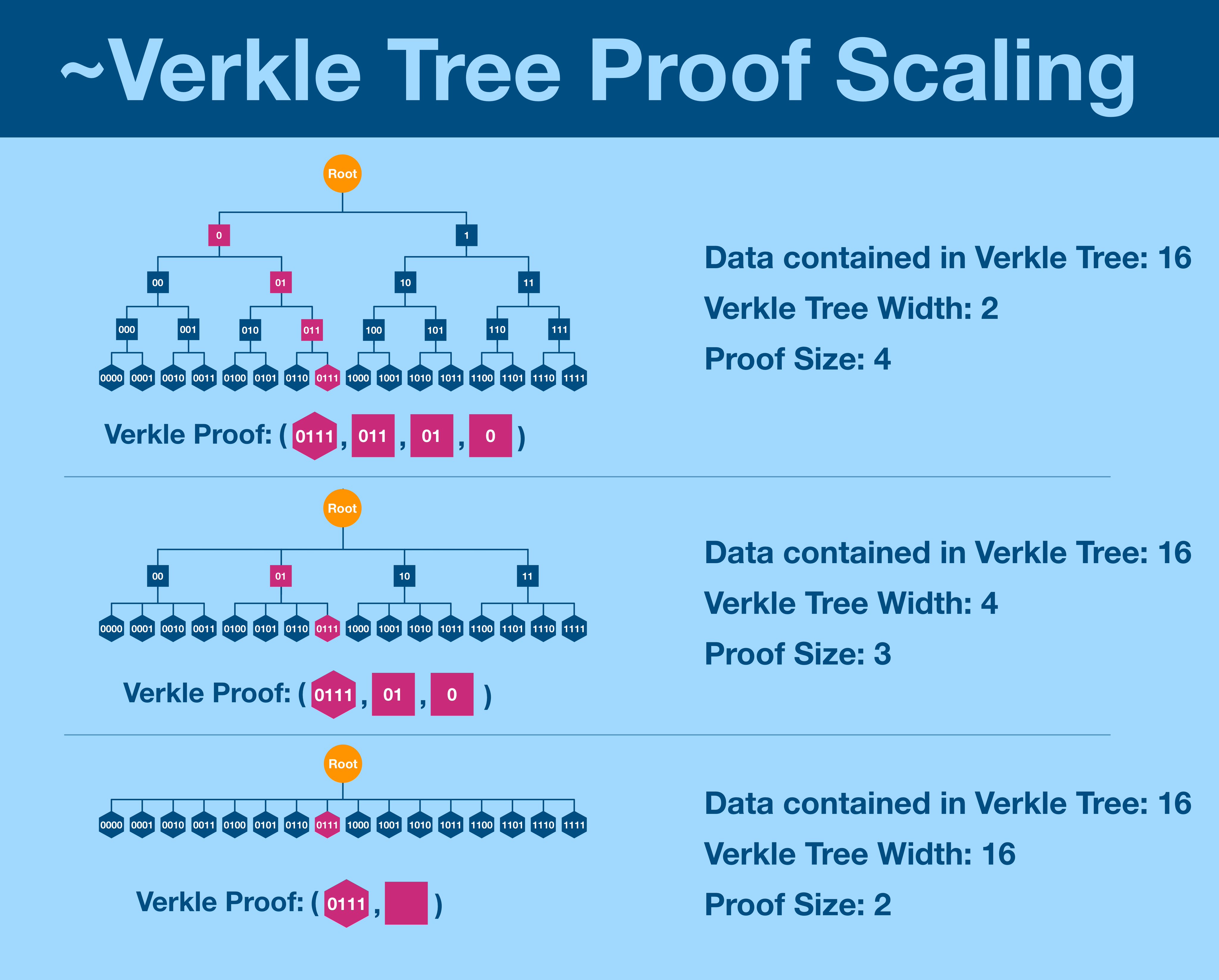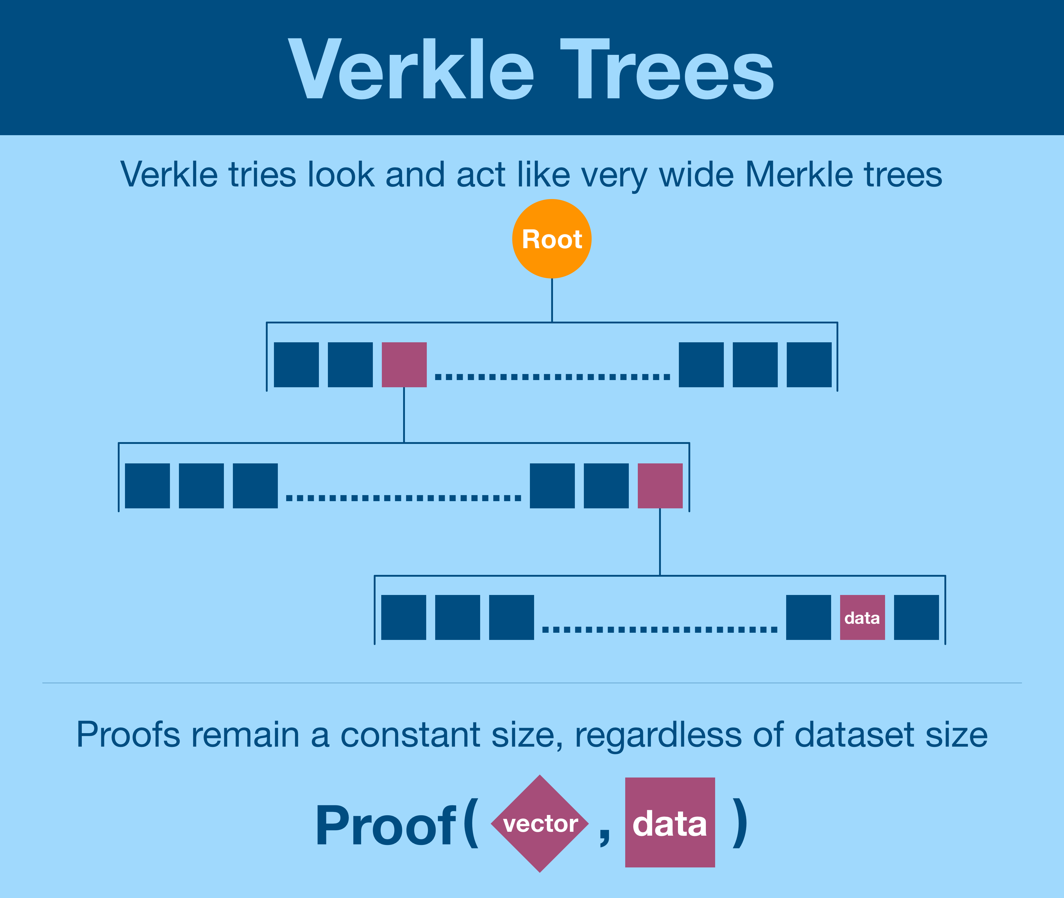 - Verkle trees, like Merkle trees, allow verification of data within a dataset