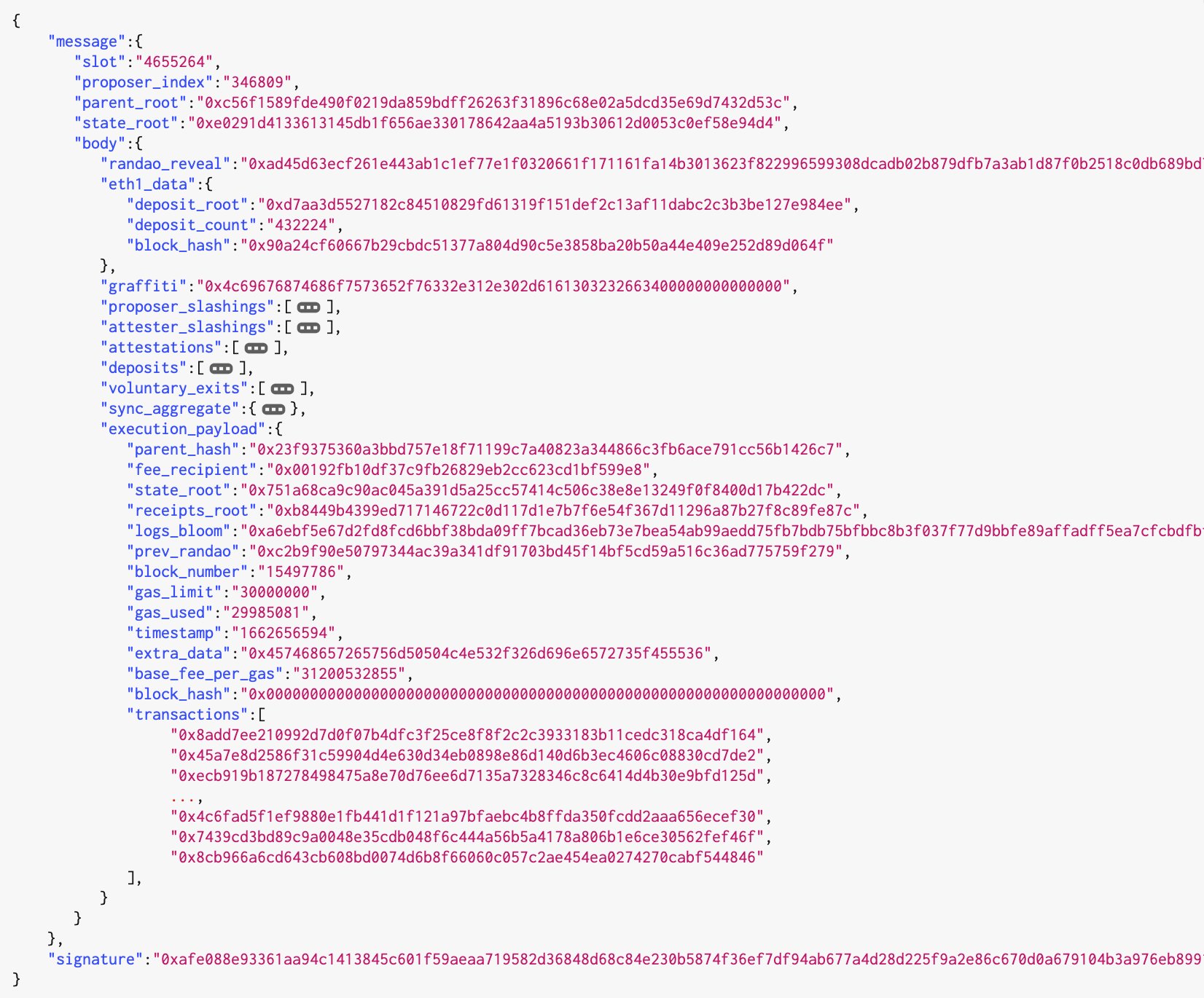 • signature - the signature the block proposer creates to take responsibility (add to blockchain and collect reward if good, get slashed if bad).
