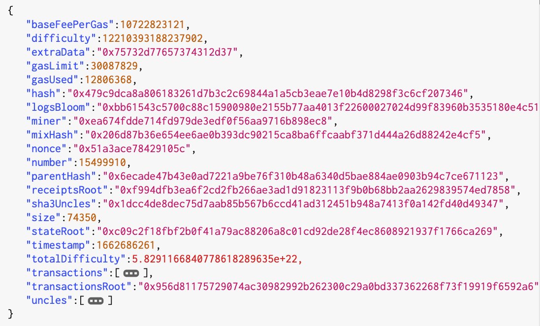 • baseFeePerGas - EIP-1559 created a minimum cost (base fee) for each unit of gas. When a block is created, the entire base fee is burned. The value changes based on how full the previous block was (max change of 12.5% per block).
