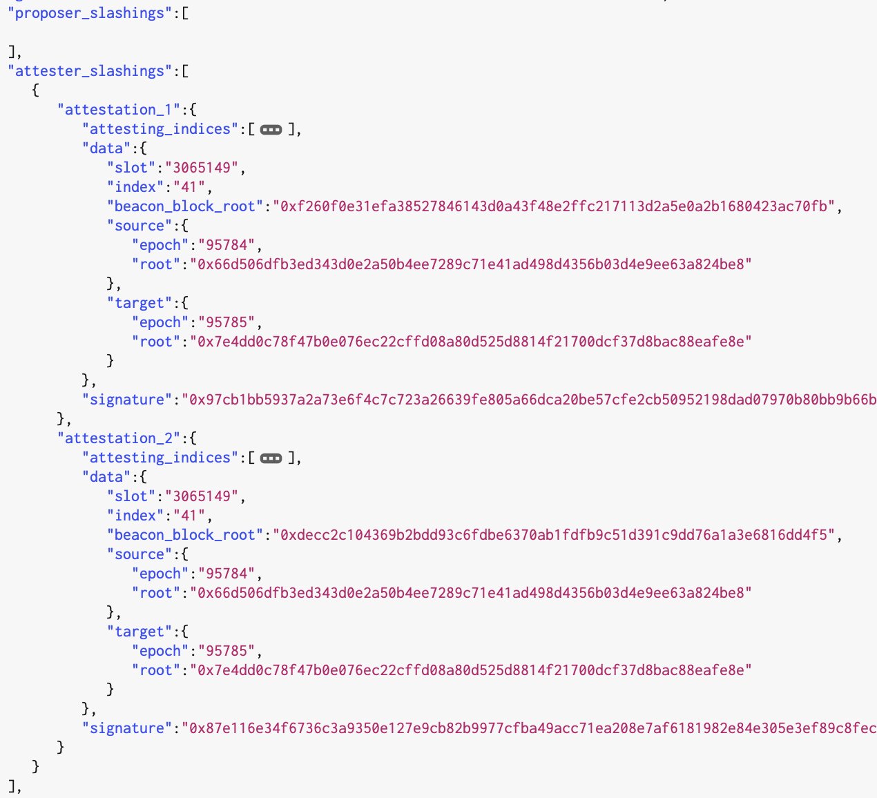 • proposer_slashings and attester_slashings - validators that have performed a hostile action against the network (for example, proposing or attesting to an invalid block). The network confiscates a portion of their staked ETH and ejects them from the validator set.