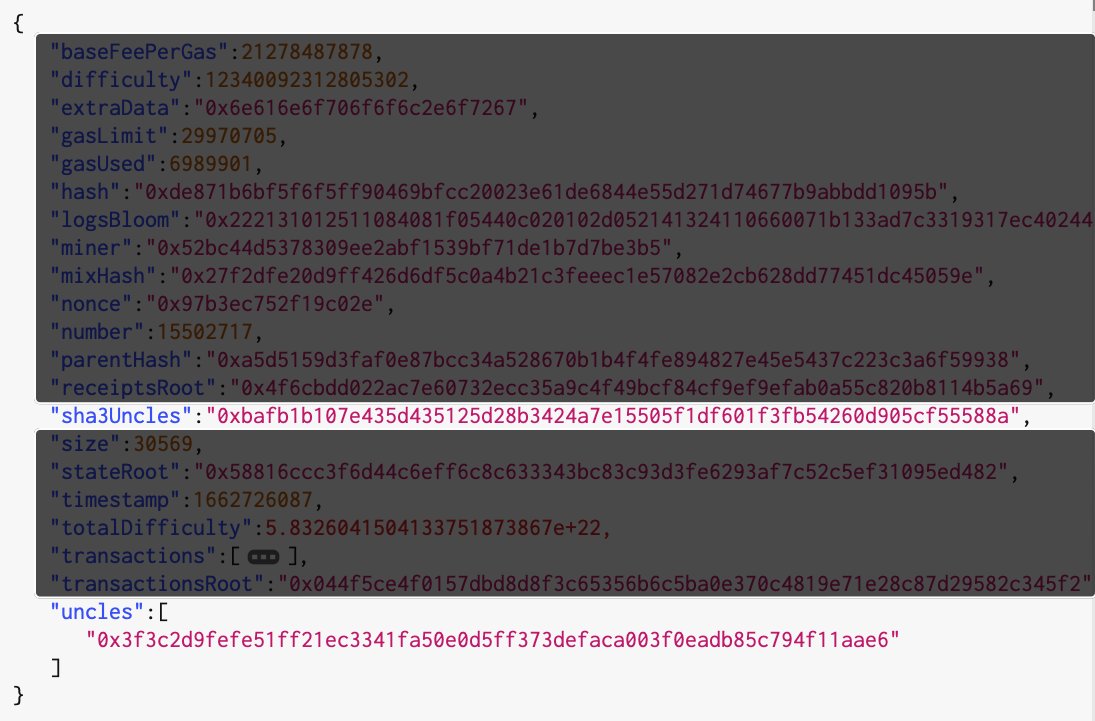 • sha3Uncles and uncles - because proof of stake does not naturally produce uncle blocks, these fields will be set to 0 (or the hash of an empty list in the case of sha3Uncles).