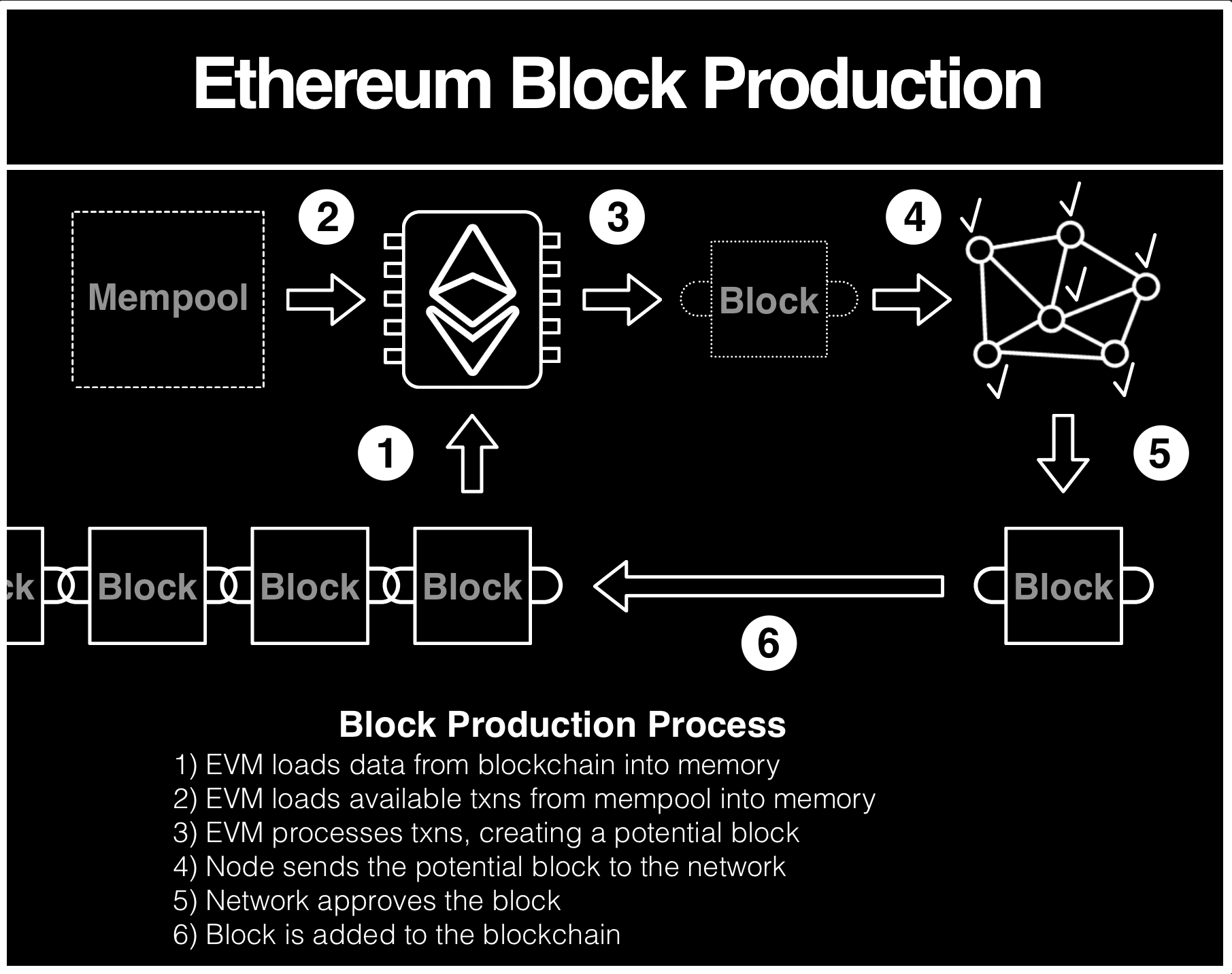 From there it can begin transacting. Potential transactions are chosen from the mempool and bundled together. The EVM then executes all bundled transactions, producing a potential block. The potential block is then sent to the network.